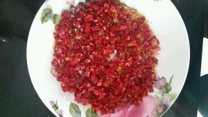 将油烧热放入花椒粒,待油冒烟,关火,捞出花椒粒扔掉,将热油均匀浇到辣椒上。