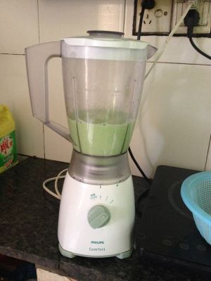 将煮好的豆米连同煮豆米的水一同倒入料理机,再加入花椒粒,直到豆米打茸