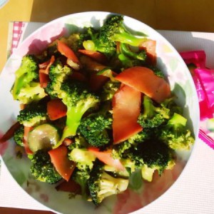锅中热油,放蒜,胡萝卜炒至微黄,放入西兰花,放酱油,炒一会儿放蒜末,出锅,放醋就好。