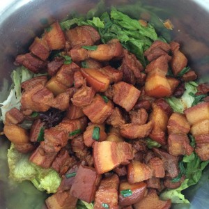 等锅里的肉和水在开的时候,这时候就要把火调小一点改用中火了,用中火慢慢煮,煮30-40分钟,如果煮到水快干了肉吃起都还不是很软的话,那就再加点开水,试一下有没有咸味,如果没有什么咸味,可以再加一点盐,不要太咸,根据你平时做菜的口味,然后再煮个10-20分钟的样子,因为肉要煮的很软吃起来才好吃,把水快煮干的时候放入味精、鸡精和葱,好,这时候把红烧肉盛入之前装有生菜的容器,好,这时一到香喷喷的红烧肉就做好了