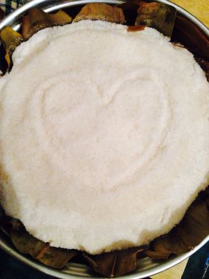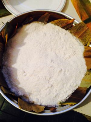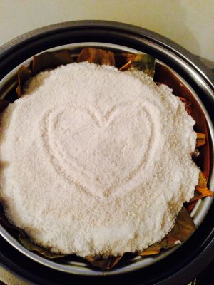 在蒸屉里铺上粽叶(如果没粽叶可以用湿布),倒入细粉用刮刀抹平