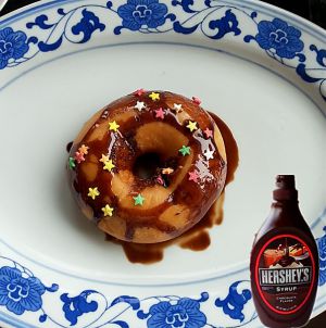 8. 取出的面包放凉到不烫手时,在上面挤上好时巧克力味糖浆,放上装饰糖豆