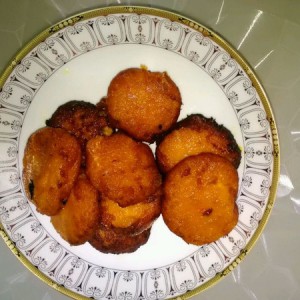 油锅烧热,然后下入南瓜饼,炸至金黄色,我的刚开始有点没有掌握好火候!
