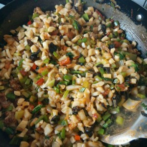 水开后放入锅中煮熟,边煮边用筷子顺时针搅动,防止面块粘连