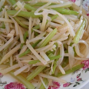 热锅凉油,爆香蒜末,加入土豆丝,芹菜,大火翻炒,加入盐,五香粉。