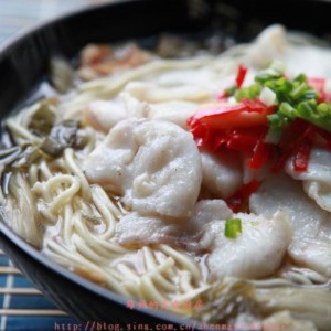 捞出面条盛在碗底,铺上黑鱼片,倒入面汤,撒上剁辣椒及葱花及胡椒粉即可。