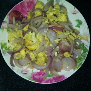 鸡蛋下锅炒好盛起,下洋葱炒熟,放入鸡蛋混合,加适量盐黑胡椒,就这样简单呵呵开吃吧!