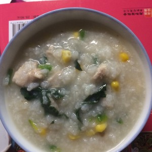 大米煮沸腾了把鸡肉放进去煮。少倾再转小火 把其它材料放进去小火熬煮。最后起锅前放入盐。