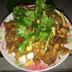 倒入炸好的肉,迅速翻炒挂汁,乘盘,撒上准备好的香菜,大功告成。