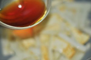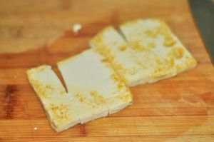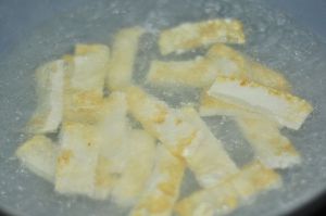 锅里加入水煮开,放入豆腐,用中火煮1-2分钟,捞起,滤干水份。(可以去除多余的油)