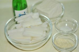 在碗里将盐 1/4勺 米醋 2勺 白砂糖 1小勺 清酒 2勺 生抽 2勺 混合搅拌至白砂糖化开。