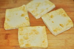 少许油,烧热,放入豆腐皮煎至两面焦黄色,装起