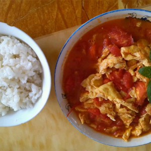 怎么样,西红柿炒鸡蛋出锅了,再配上一碗米饭。舒服.:-P