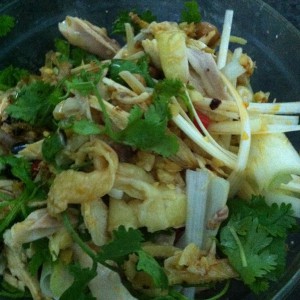 淋到撕好的主料上,放如盐巴,香菜,大葱,花生和香油,搅拌即可!