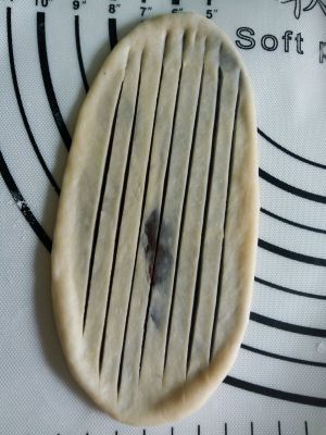 擀成长条,划上几刀,不能划断哦,轻轻划表面一层就可以了!
