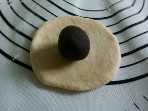 取一小团,擀成圆形,包上豆沙,捏紧