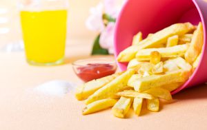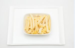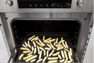 准备:在烤盘上铺一层锡纸,再将冷冻的薯条平铺在烤盘上,均匀地撒上盐和黑胡椒粉。(冷冻薯条一般超市里都可以买到,如果喜欢DIY,可以将一个400克的土豆削皮后,切成截面为0.5厘米见方的长条,在淡盐水中浸泡10分钟,取出后用厨房纸拭干水分,放入烤箱,温度设为200℃,定时20分钟烘焙即可。)