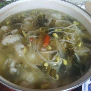 将黄豆芽和酸菜放入水中煮,加盐和辣椒酱调味,煮8-10分钟后下鱼片,铺在表面即可,滚一下就行,才能保持鱼肉的鲜嫩。