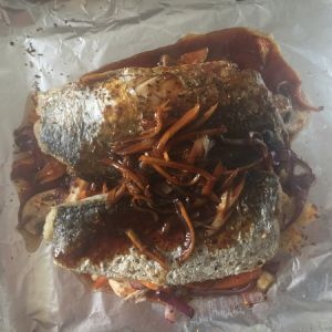 鱼烤好,将刚刚调好的汁倒在鱼上。锡纸直接从烤盘移到盘子上(小心不要弄破),烤盘都不用刷。完成!