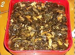 菜干放进温水里泡软,清洗干净,剪成小段;
