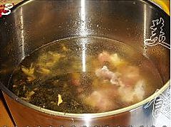 把洗干净的米、菜干、姜片、用水冲洗干净盐分的排骨放进锅里,加入6碗清水,大火煮开后,转小火煮1个小时;