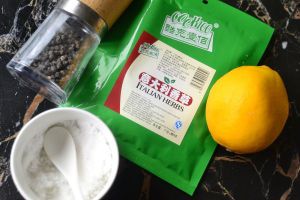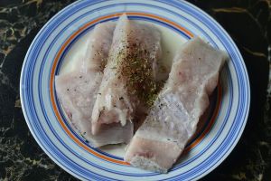 鱼块用少许香草、柠檬汁、黑胡椒颗粒、盐和白葡萄酒腌制15分钟