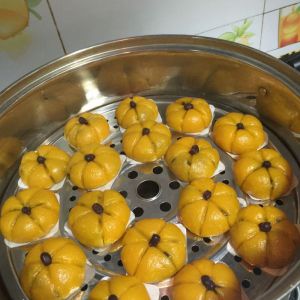 包入蜜豆,然后封口再次揉圆,上面轻轻压扁;压扁后用牙签压出三道线,力度稍微大点,以免蒸熟了痕迹变浅;压出三道线后,用牙签在侧面也稍微压一下,用一粒红豆装饰南瓜柄,这样南瓜形状就出来了。