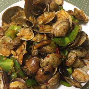 放入花蛤和青椒,翻炒,放白糖、生抽及配料青椒,快速翻炒