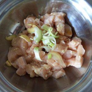 鸡胸肉切丁,用水洗净沥干水分。加入葱片姜片、盐、酱油、鸡精/味精、料酒和少量干淀粉拌匀,腌制半个小时。
