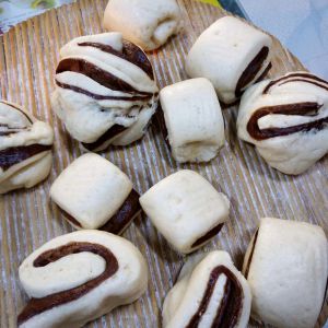 待发酵后把可可粉的面团擀成一厘米的面皮,和另外一个大面团共同卷起,然后切成小段既可。