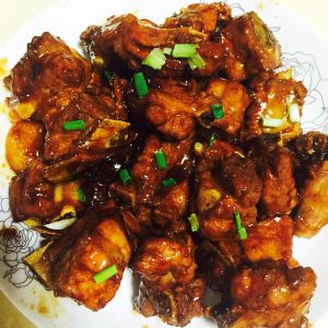 倒入排骨翻炒上糖色,再放姜,蒜在翻炒