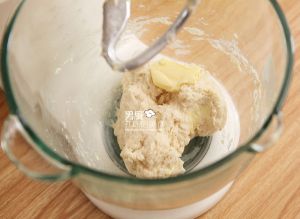 将高粉、全麦粉、酵母、牛奶、盐、白砂糖放入厨师机中,搅拌成型后加入黄油。