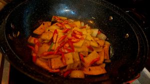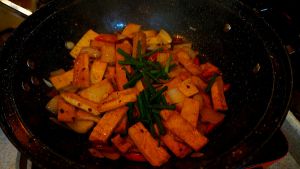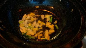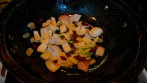 在放入切好的洋葱,干辣椒段儿,少许花椒炒香