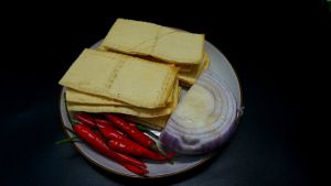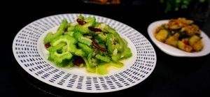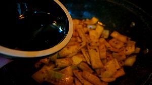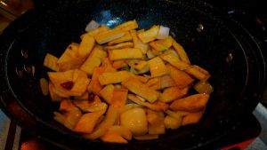 煎豆干的油留少许,放入生姜大蒜片葱头爆香
