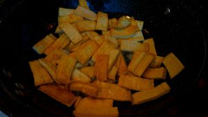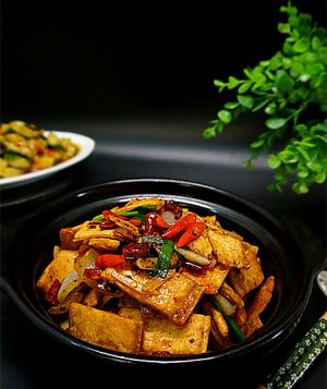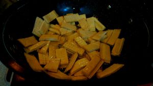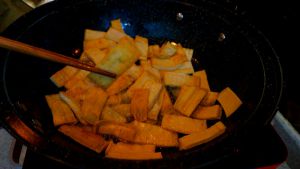 锅里放入少许油,烧制六成热时放入白豆腐干,转中小火煎至