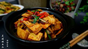 调制好的酱汁儿也可以倒进去了,让酱汁均匀的覆盖在豆干上,盖上盖大火焖煮