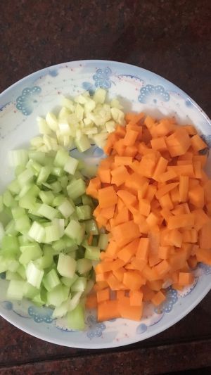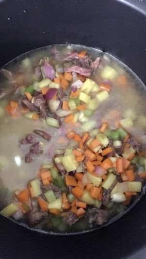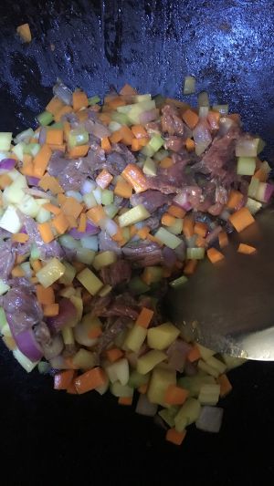 先放油蒜末逼香,大火爆炒四种配料,放盐两勺,放蚝油少许,酱油少许,牛肉最后放,不用炒太久,因为要放到电饭煲焖,太熟了不好吃,起锅
