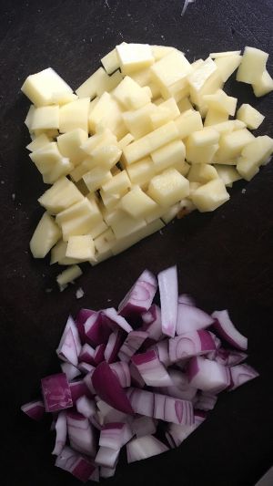 把米和水放好,跟平时煮饭一样,也可以比平常在少点水,配菜全放进去,铺平