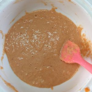 把糖,炼乳,鸡蛋,面粉放入,再加一点水,拌成糊状。