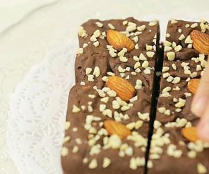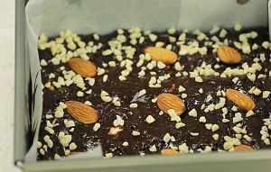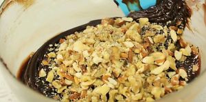 倒入一个10寸方形模中,用一些完整漂亮的坚果装饰。(一定要垫张硅油纸,方便脱模。)