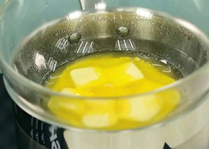 黄油隔水加热,化开后加入糖粉和盐并搅拌均匀。