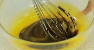 将巧克力化开倒入第三步的混合物中搅匀。(加入巧克力前,混合物必须搅拌均匀。)