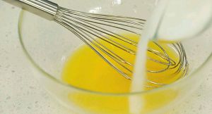 让第二步中混合物冷却一会儿再加入鸡蛋搅匀。(不要等完全冷了,也不能太烫以免把鸡蛋烫熟。)想加稀奶油的,可以将稀奶油放至室温再加入,不要加太多。