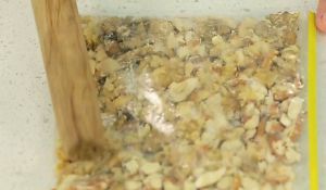 一部分核桃仁放入烤箱150°烘烤5分钟,然后放入保鲜袋用擀面杖敲碎。