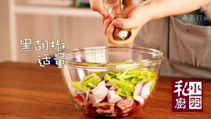 ▲找一个大碗,把牛腩切成大块放进去,再放入胡萝卜块、洋葱块、芹菜段、香叶、蒜瓣,加入1大把现磨的黑胡椒碎。