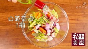 ▲白葡萄酒选很普通的大概100块钱左右的就可以,倒入白葡萄酒,没过所有的食材。