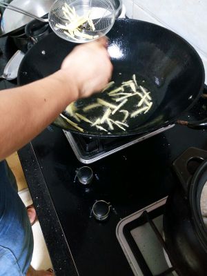 把油弄热,油热了,再放土豆,土豆变成金黄色就捞出来,放凉了就重复炸一下。