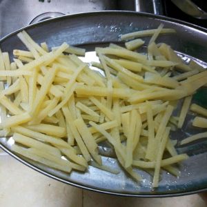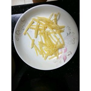 这个是切好,捞过水的,(捞水的时候水放点盐去。炸出的薯条就不用放盐了,薯条就有盐味了。)再放进冰箱去急冻。