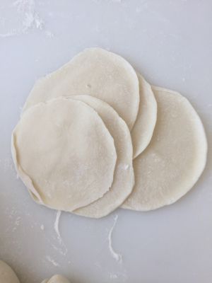 面粉用开水烫一半,温水和一半,揉成光滑的面团,醒制10分钟左右,揪成大小均匀的剂子,擀成圆形的薄饼。