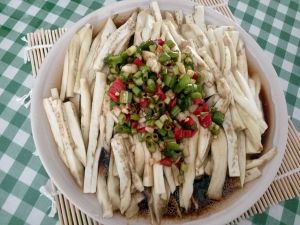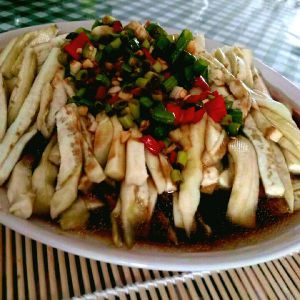 茄子出锅后自然放凉,淋上调好的汤汁。
